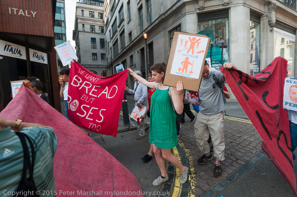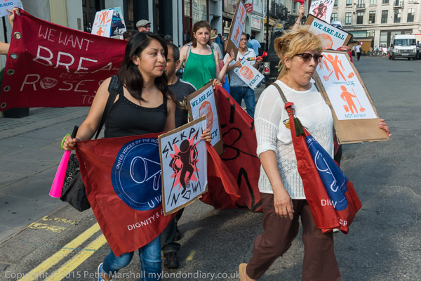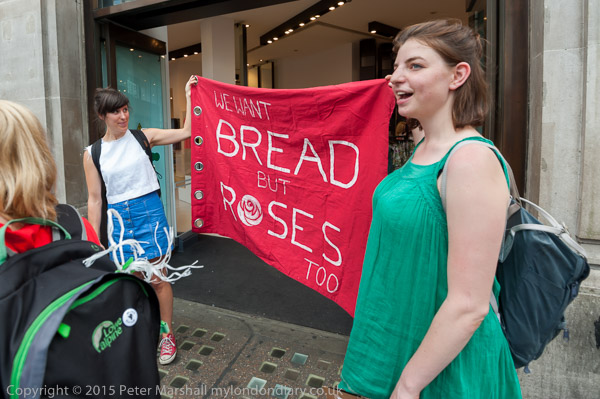 Barbara one of the Sotheby's cleaners kneels and Vera holds up a poster 'Sick Pay Now!'