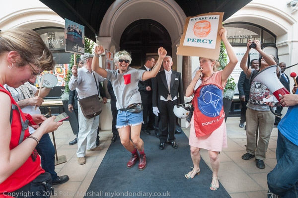 Adam Clifford from Class War dances on Sotheby's carpet which is on the pavement