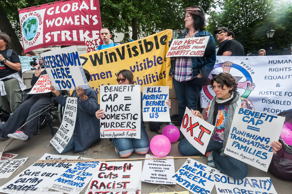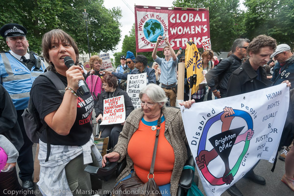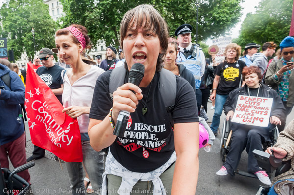Paula Peters holds up two balls with messages for Osborne and Cameron