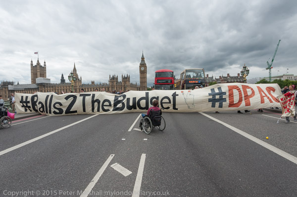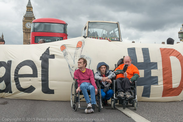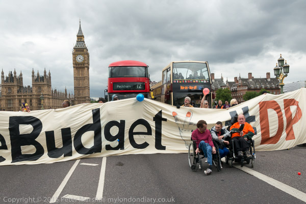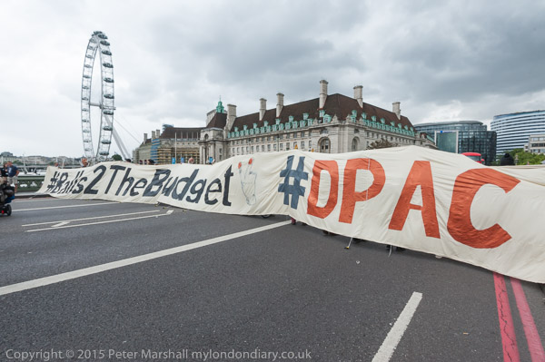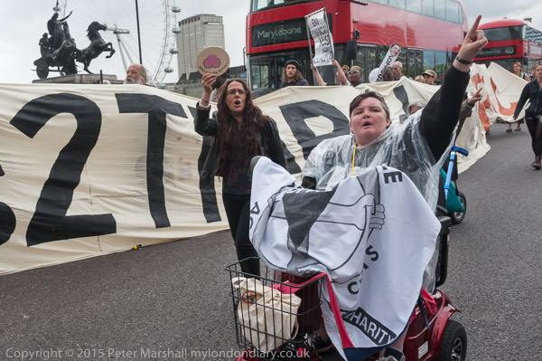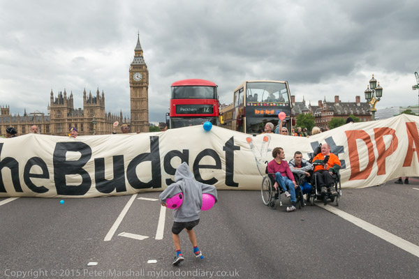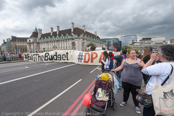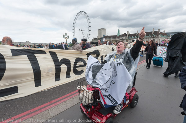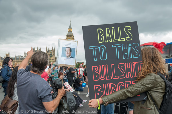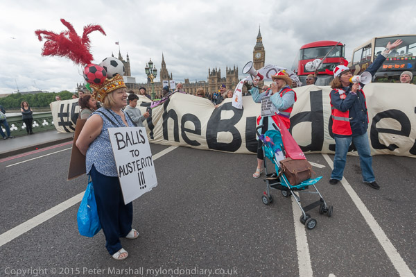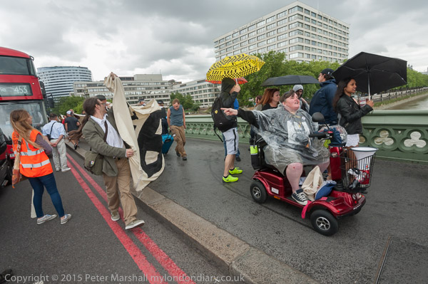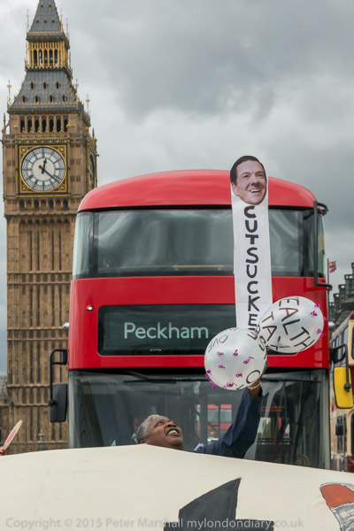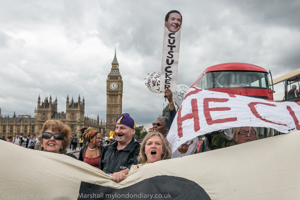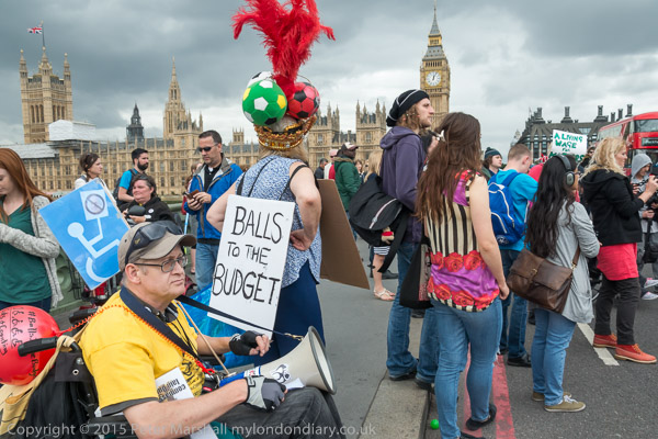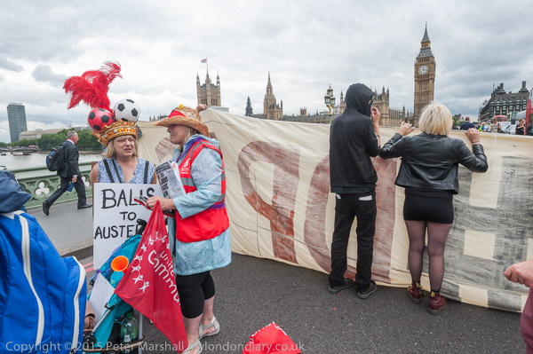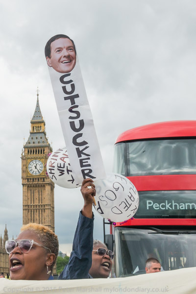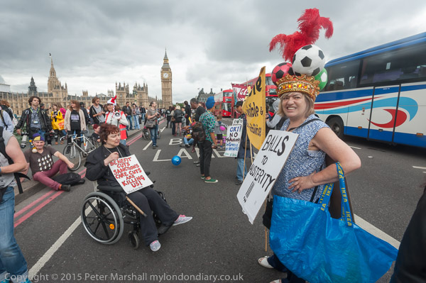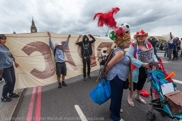There was something of a carnival atmosphere on Westminster Bridge despite the anger many feel at Tory cuts