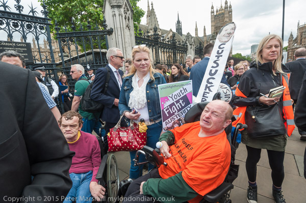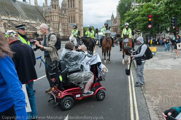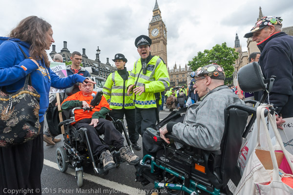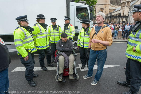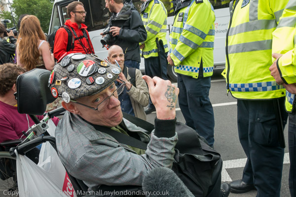 Protesters in wheelchairs are warned they may be arrested if they continue to block the road