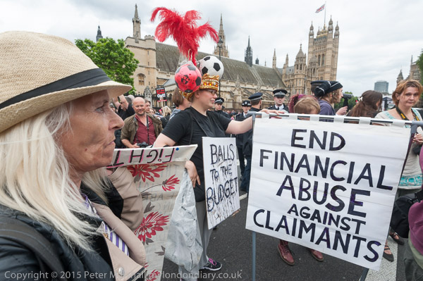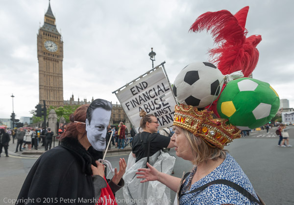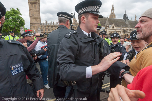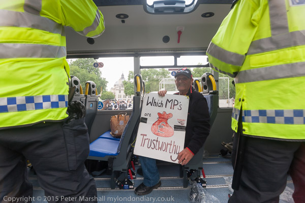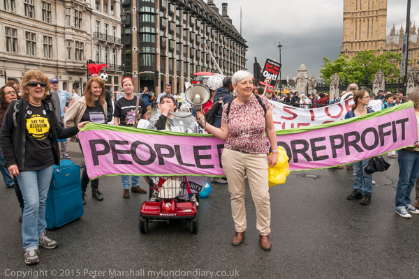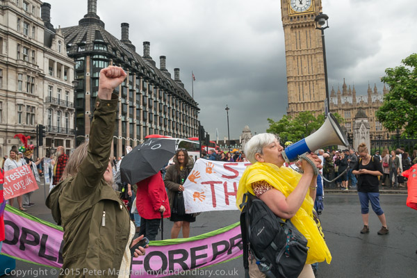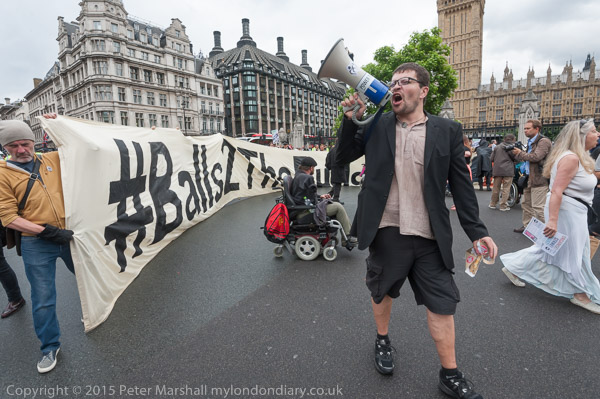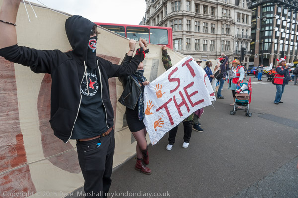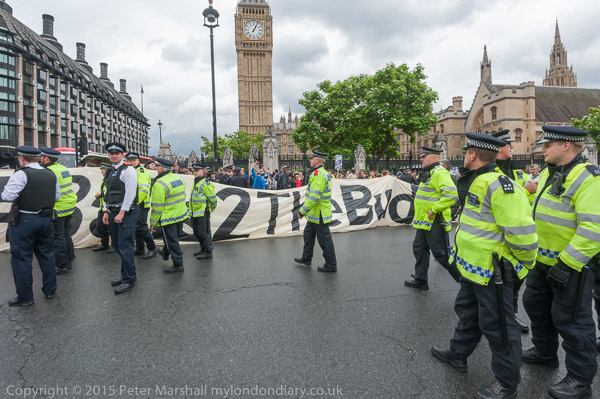 The huge banner stops traffic in front of the Houses of Parliament and down Bridge St