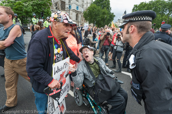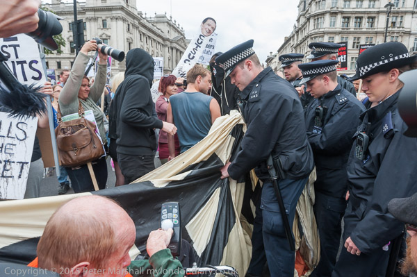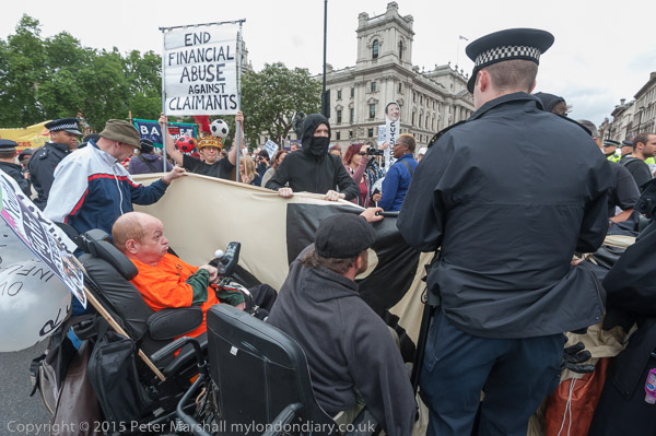 Police try to grab the large banner and DPAC members move wheelchaits to try and block them