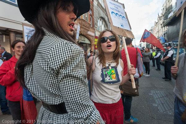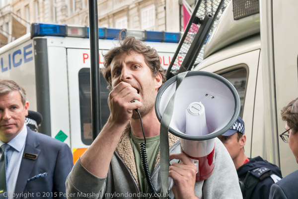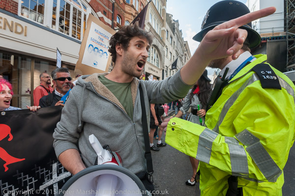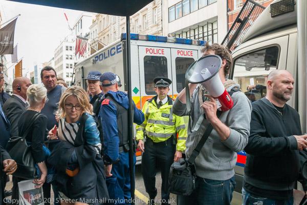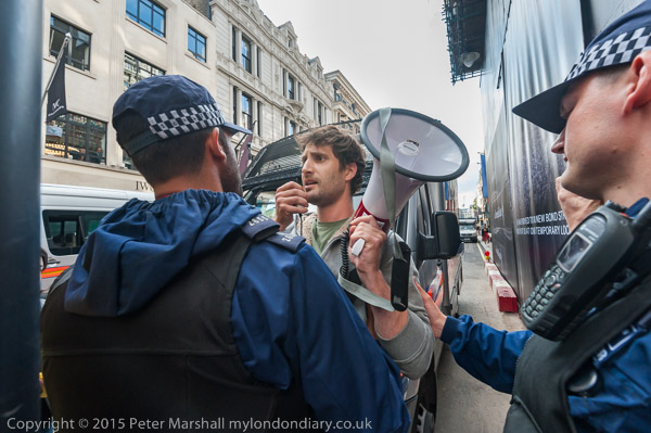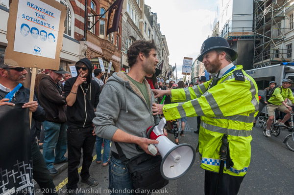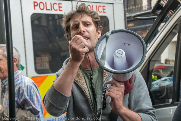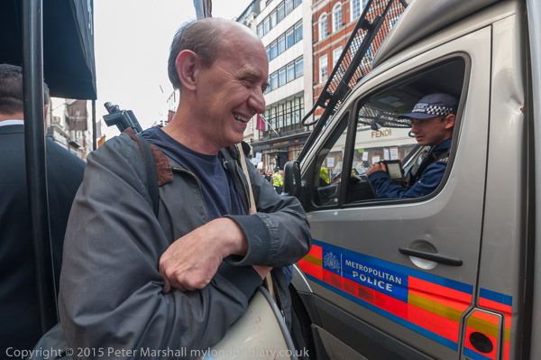 Sandy Nicoll from SOAS Unison smiles at police who ask him to move. But two vans of reinforcements had arrived