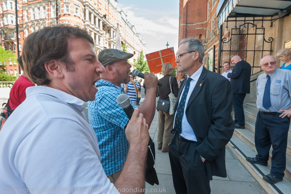 The protesters take no notice of being told to move. They are not obstructing the entrance and have no need to move away