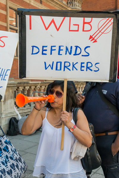 'IWGB Defends Workers' and a woman drums in protest