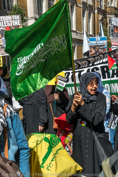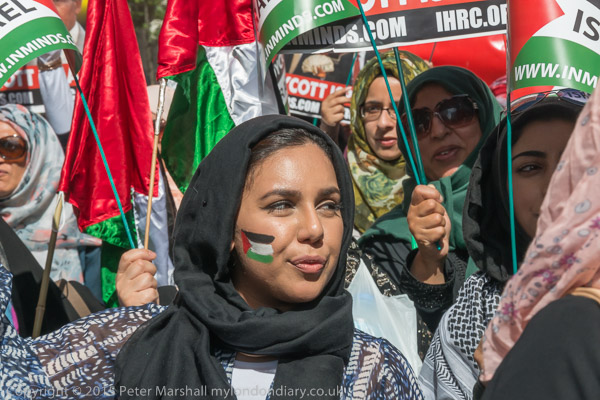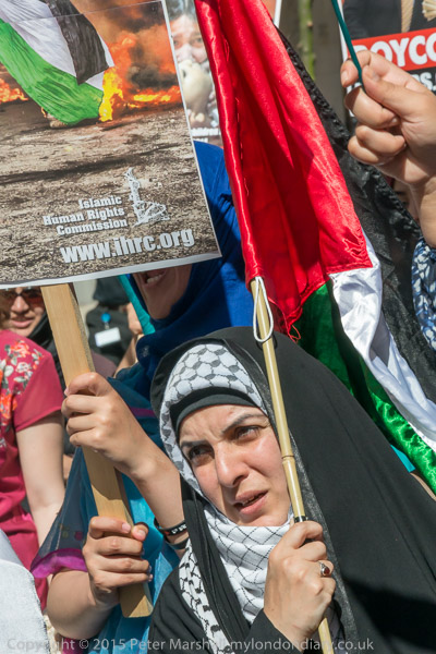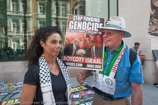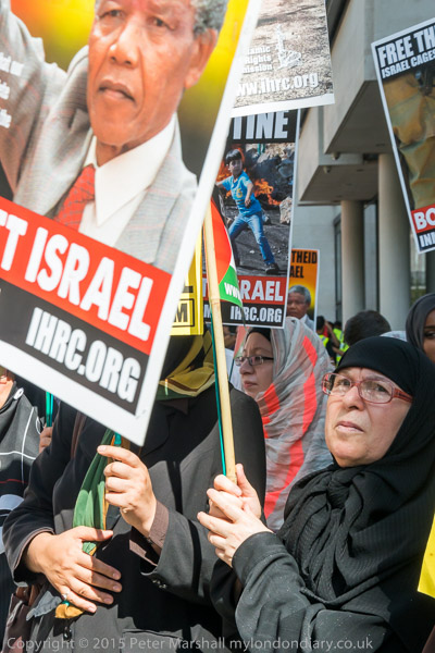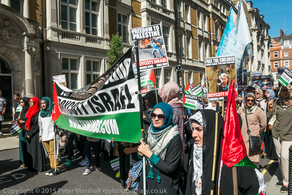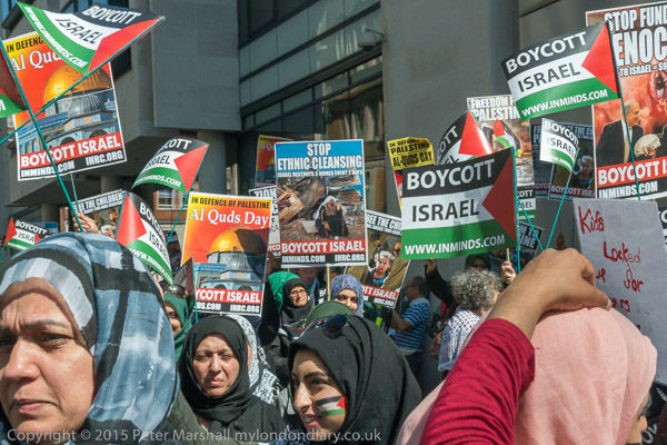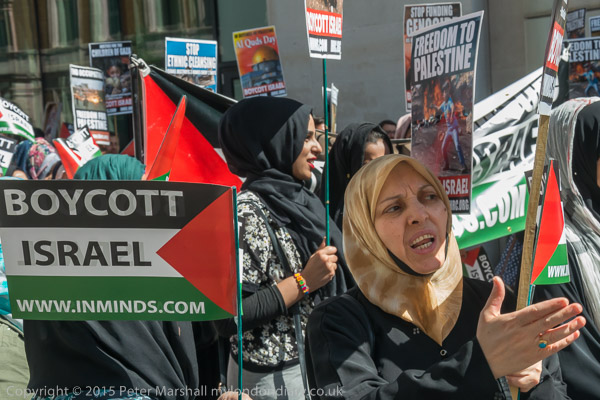 another waves a Palestinian flag with the message 'Boycott Israel'