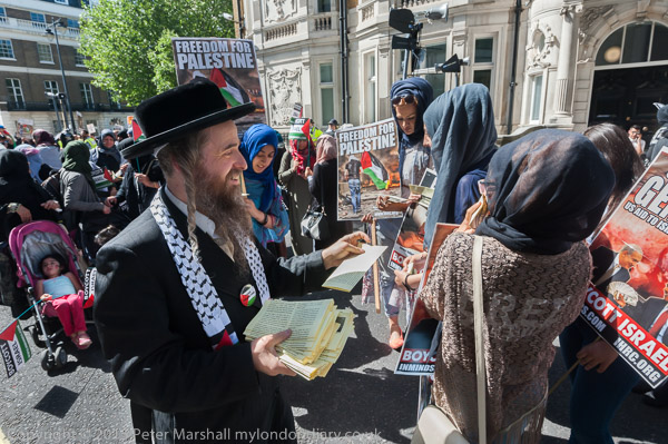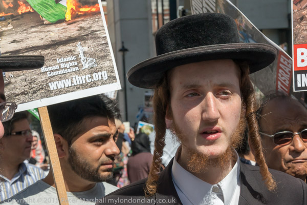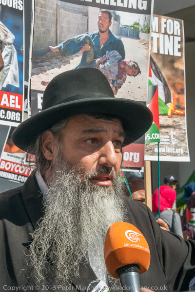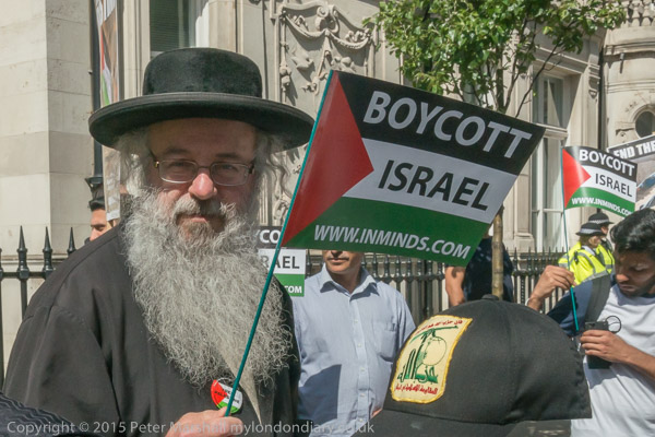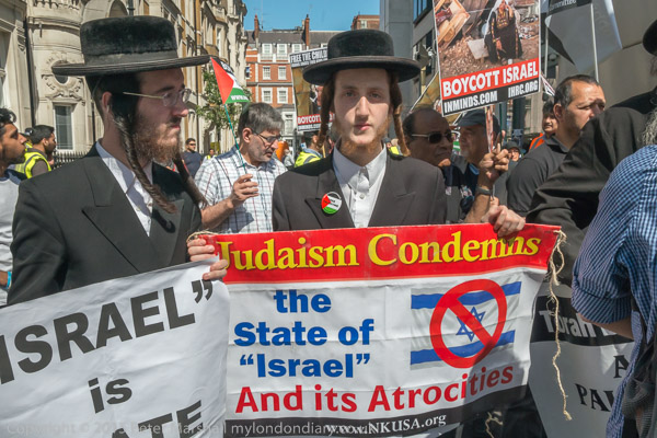 NK Jews hold posters. One says 'Judaism Condemns the Stateof "Israel" And its Atrocities'