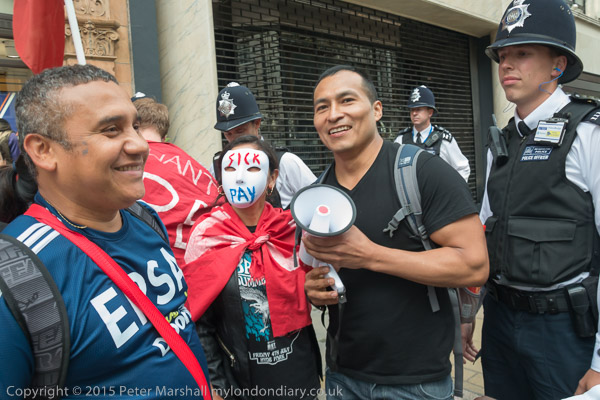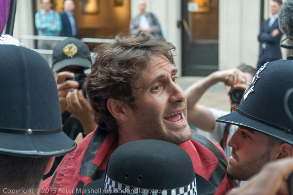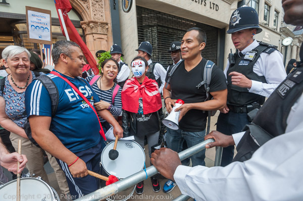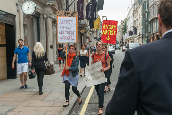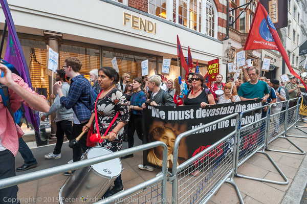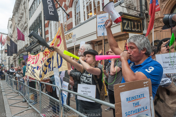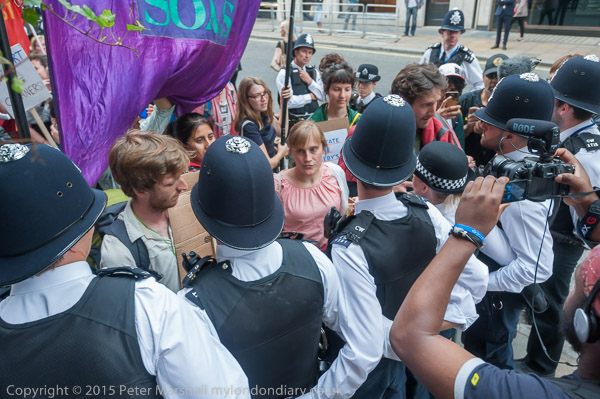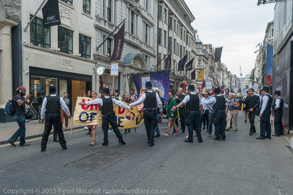 Police again stop the marchers as they approach Sotheby's closed front entrance on New Bond St
