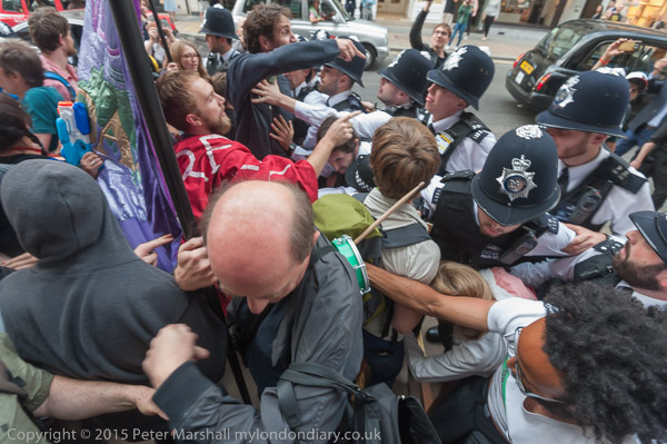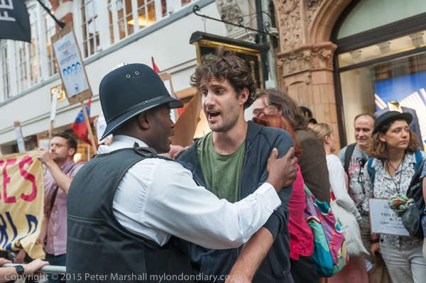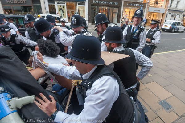 Police restrain Petross Elia who is complaining that the protesters are not being allowed to protest