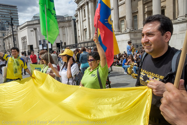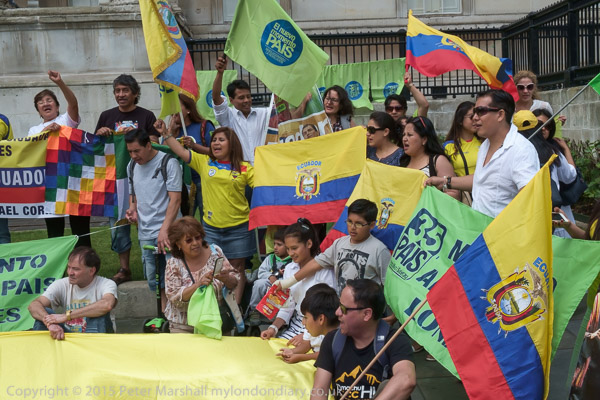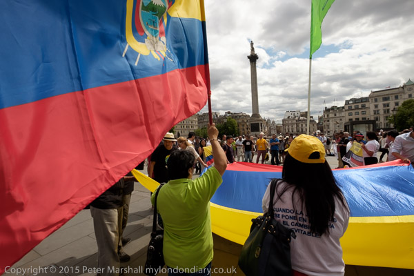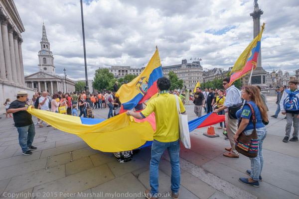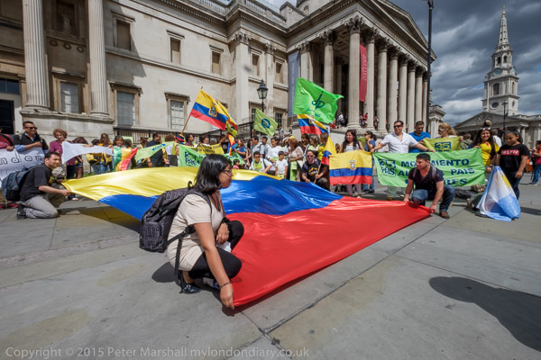 Ecuadorians stretch out a large national flag in front of the National Gallery