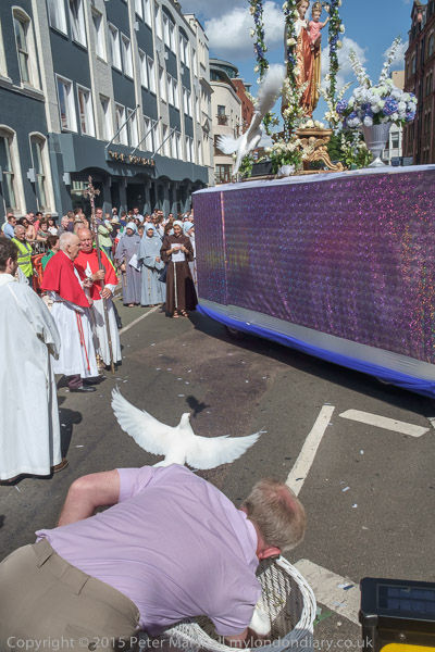 Three more doves as the float carrying the statue of Our Lady of Mount Carmel on a float joins the procession