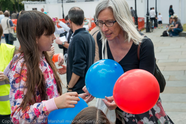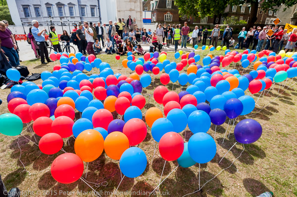 The balloons are coloured to map the UK seats for the different parties, Yellow is for SNP