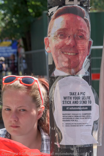 A large banner at the back of the protest calls Robin Wales 'The Sherrif of Newham, Robbing the Poor'. He is developing Newham to attract new and