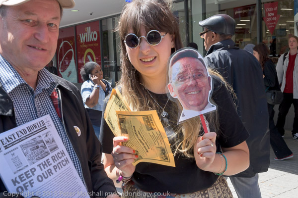 With the protesters holding it as they hand out leaflets. And the East End Howler headline 'Keep the Rich off our Pitch'