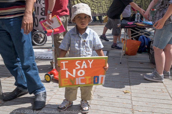 The Robin Wales selfie stick and a young protesters with a sign 'I say No Eviction'