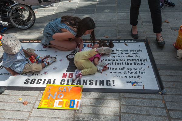 'London for EVERYONE not just the rich' and 'Stop selling public homes & land for private profit.'