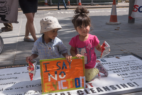 Their banner says 'No Social Cleansing' and 'Stop forcing people away from their support networks',