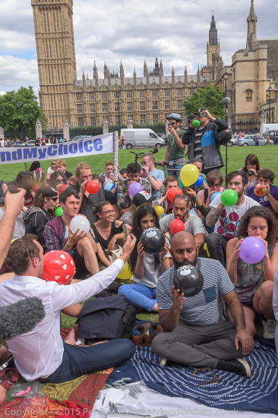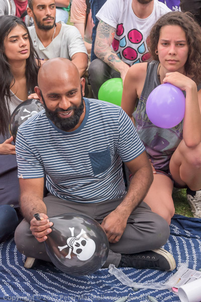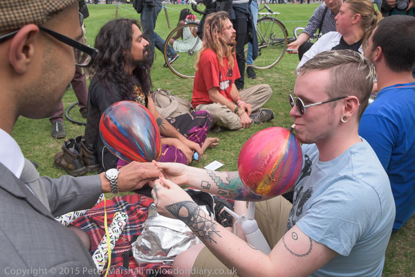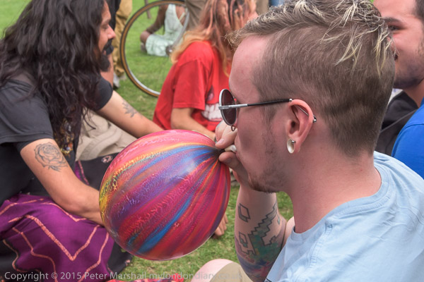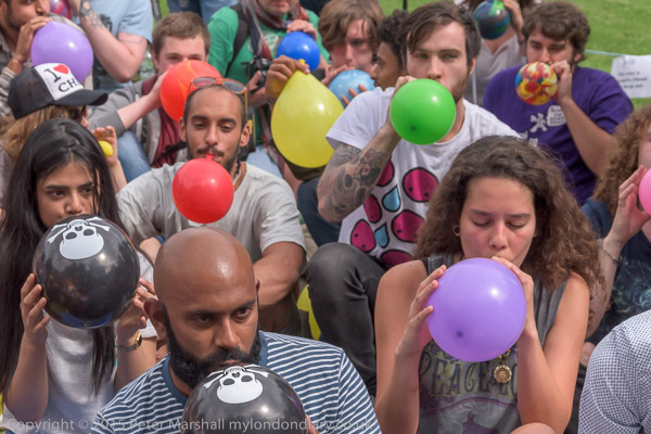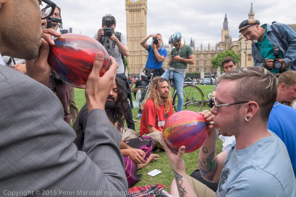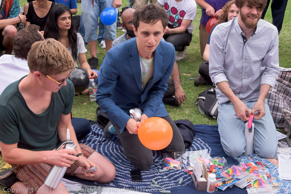 Protesters fill balloons with nitrous oxide.