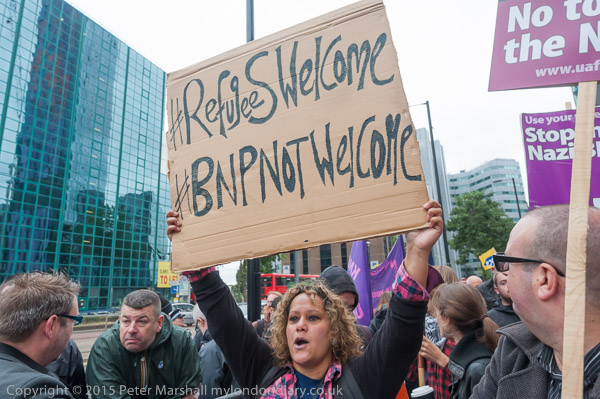 Several hundred anti-Nazi Unite Against Fascism protesters faced just 20 people waving flags in a BNP national demonstration calling for an end to immigration. The UAF made clear that refugees were welcome here. Police kept the two groups apart.