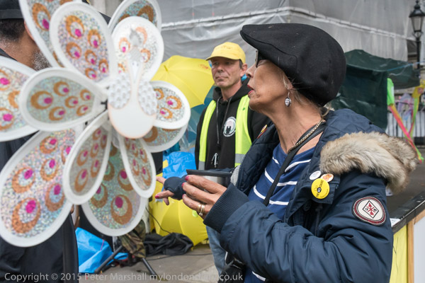 The roundabout outside the eastern gate to the Excel Centre had been surrounded by stout fencing to prevent the protesters setting up a camp there. The Excel centre claimed to own the land, but later it was said to belong to Newham Council who had not given permission for it to be fenced. Occupy Democracy instead camped on council-owned land a few yards away.