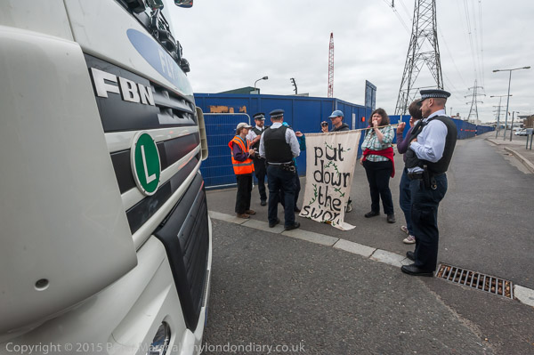 Campaigners stopped a lorry bringing a military vehicle to the DSEi arms fair, blocking the road for several hours in the first of six days of protest against the world's largest arms fair which today had the particular theme 'Stop Arming Israel'.