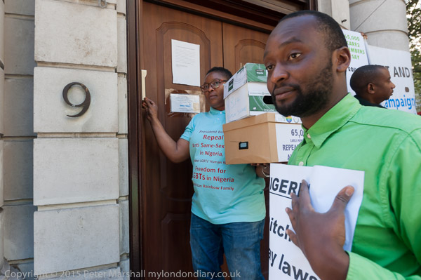 A rally at the High Commission put pressure on Nigerian President Muhammadu Buhari to uphold LGBTI human rights and attempted to hand in petitions with 65,000 signatures urging the repeal of all Nigeria’s anti-LGBT laws but the doors were locked.