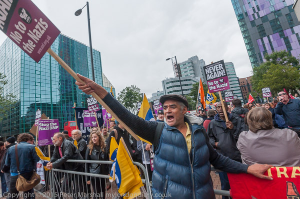 Protesters shout across the gap to a hdnful of BNP supporters who have arrived on time
