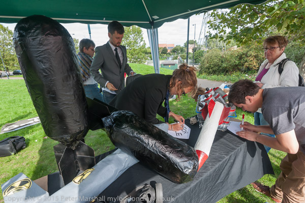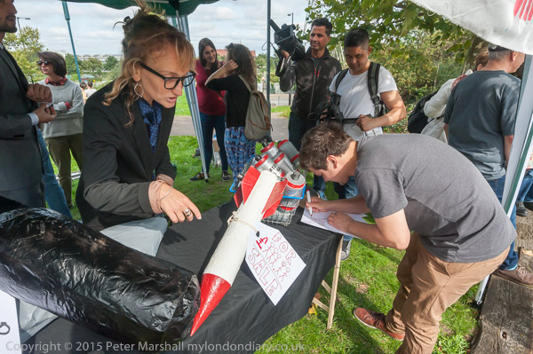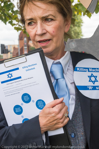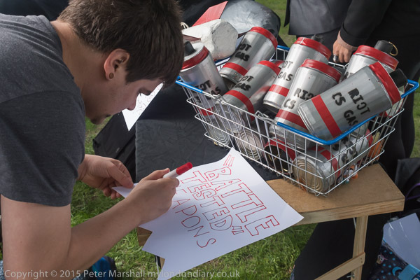 Writing labels for the rockets and bombs in the 'Israeli Pavillion of Shame'