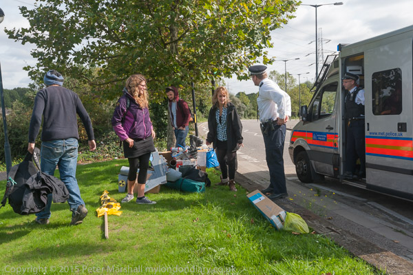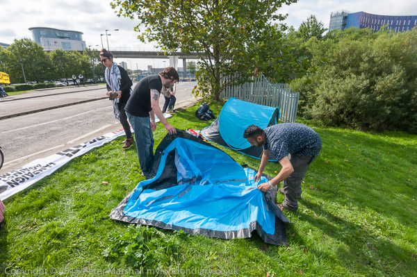 Setting up tents. The protesters arrived to find the roundabout had been fenced off, possibly illegally, by Excel