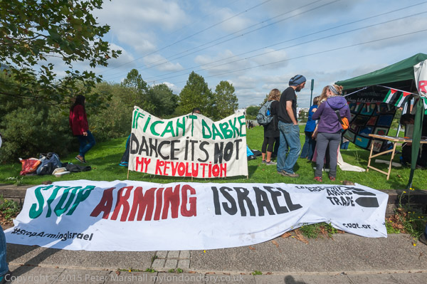 Banners included several with the message 'Stop Arming Israel' and one 'If I can't Dabke Dance Its Not My Revolution'