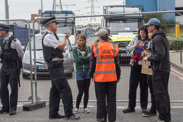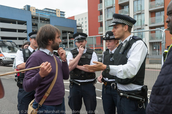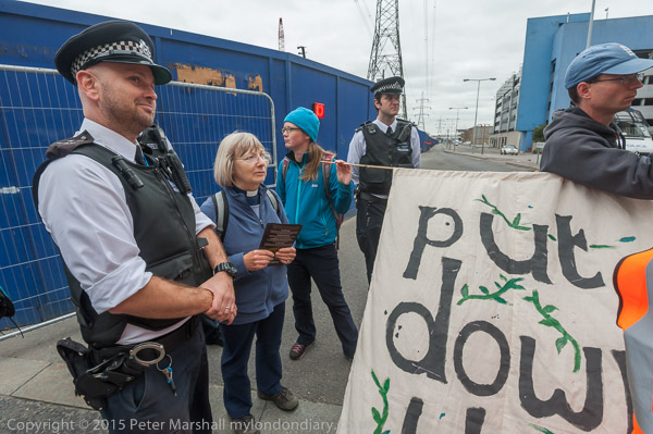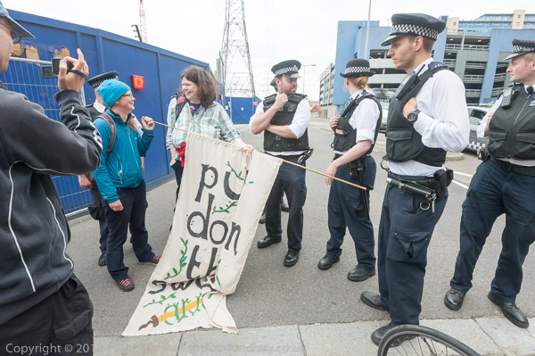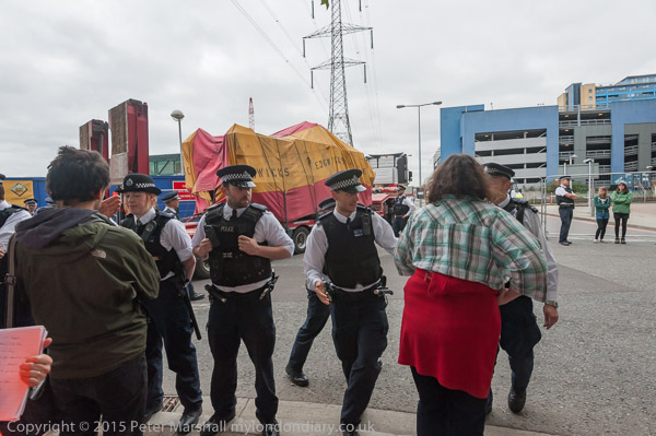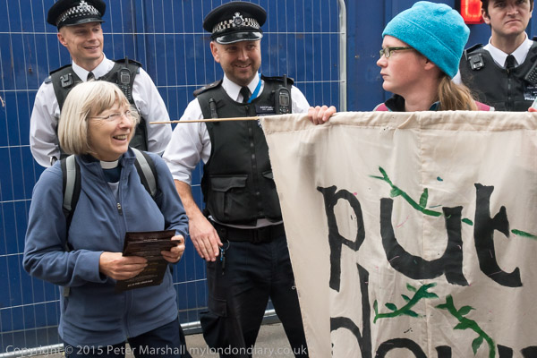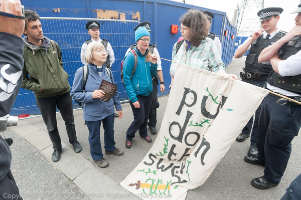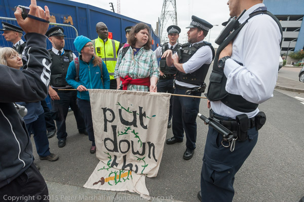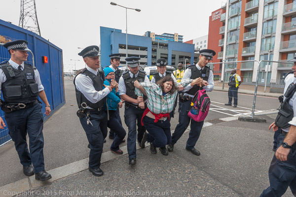 Eventually the police drag away to two protesters who have refused to move