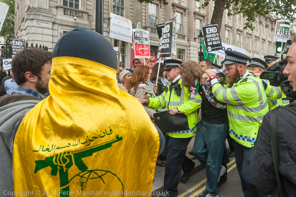 ![]() and another shouts out slogans, callinf for Palestine to be free ![]() ![]() ![]() ![]() Police clear a gap between the two groups facing each other outside the gates of Downing St ![]() ![]() There are still mnay protesters on the opposite side of the road ![]() ![]() There is a densely packed crowd calling for an end to the siege of Gaza and a free Palestine ![]() And a much smaller group shouting back at them ![]() Police struggle to hold back the protesters and a man with a Hezbollah flag draped around his shoulders watches ![]() A pro-Israel demonstrfator at right gloats as a Palestinian supporter is led away ![]() |