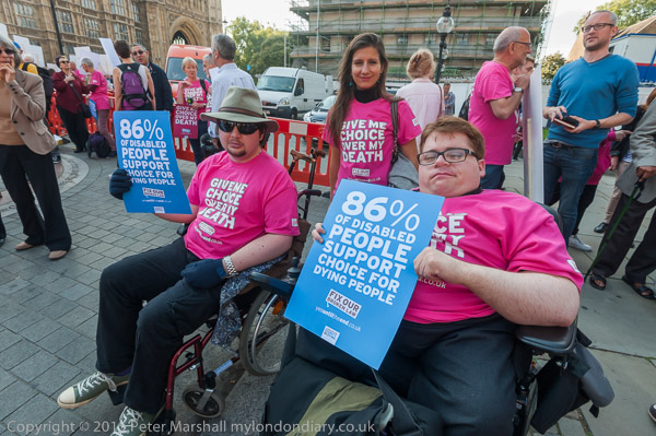 Two protesters in wheelchairs hold posters '86% of disabled people support choice for dying people'