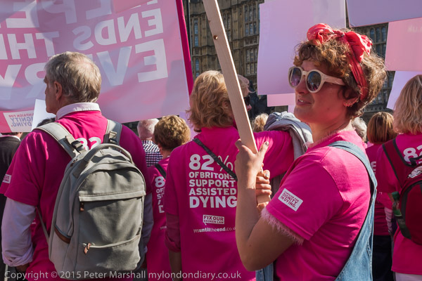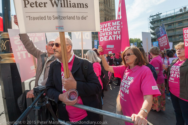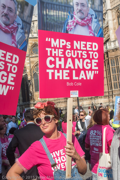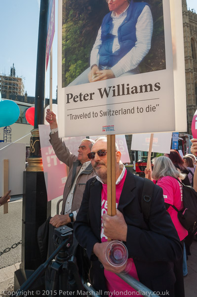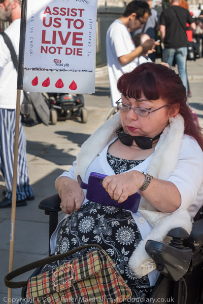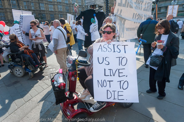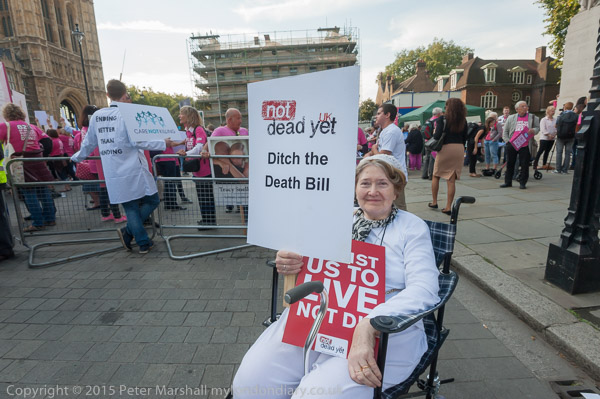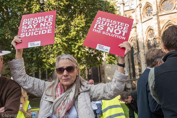 Also against the bill were a number oof prominent supporters of DPAC. Paula Peters holds a poster 'Assist us to live, not to die'