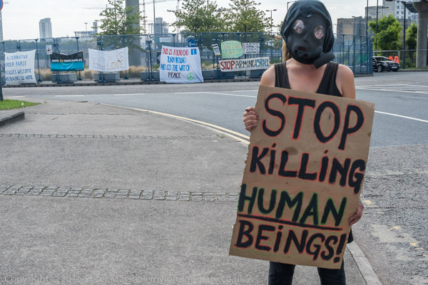 A campaigner in a gas mask holds a poster for lorry drivers to read 'Stop Killing Human Beings'