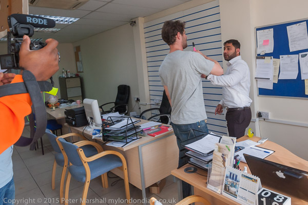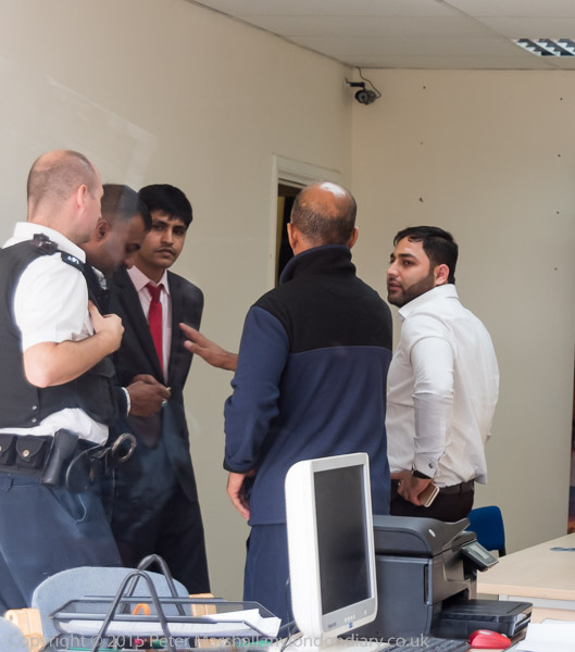 Pollice arrive and the two officers go and talk with Usman Bhatti and others inside the office