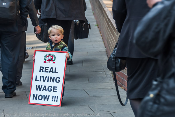 A young protester struggles towards the court with a horn and a poster for a 'Real Living Wage Now!'