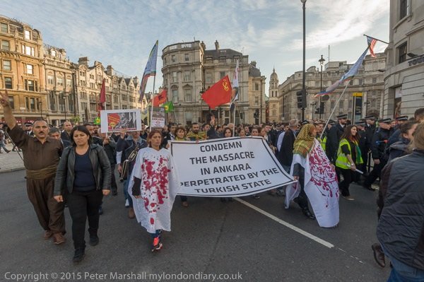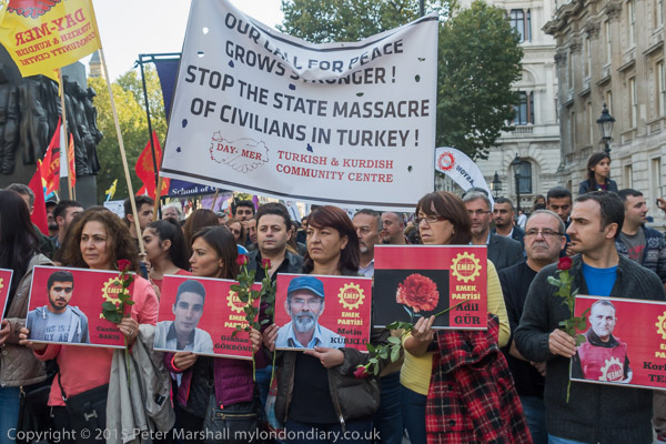 People march up Whitehall behind a Day-mer Banner hodling pictures of some of those killed in Ankara massacare