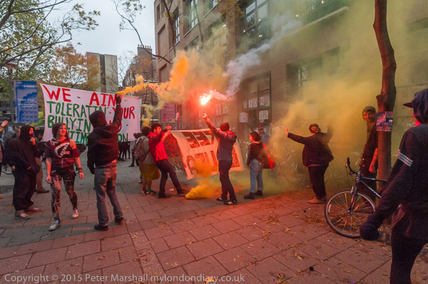 Outside the occupation flares are lit