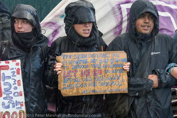 ![]() Protection Not Prisons ![]() ![]() Rain was pouring down ![]() As the rain slackened off, two people climbed ladders holding each end of a long banner ![]() ![]() Behind the rain came some sun ![]() I htink the big banner had two sides with the same message ![]() ![]() #SetHerFree - most of those held in Yarl's Wood are women ![]() |