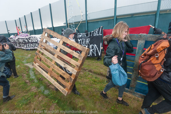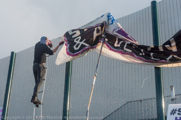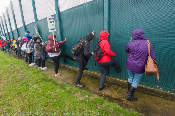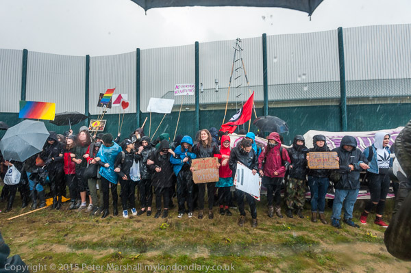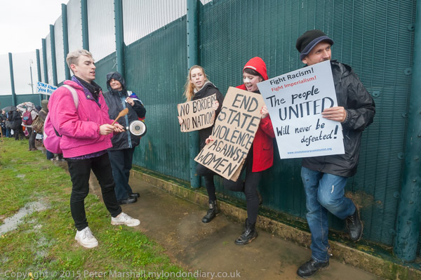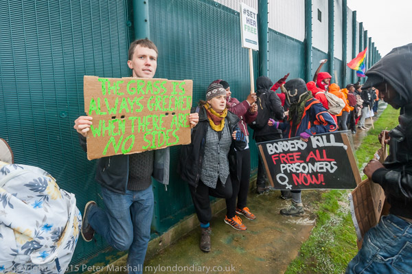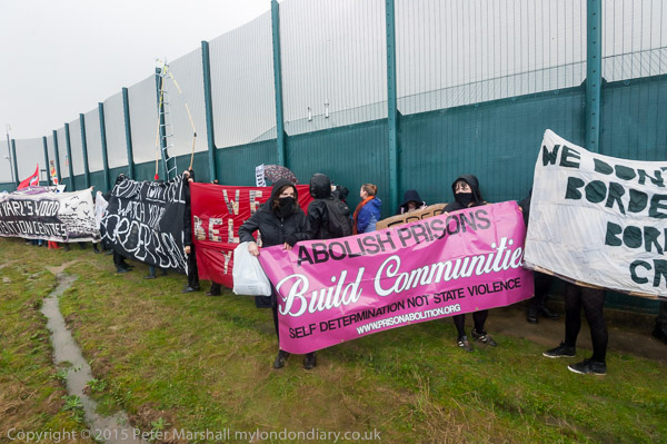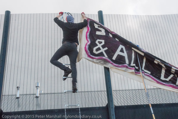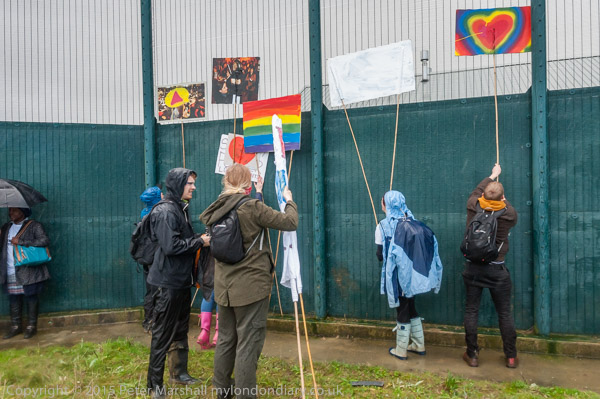 ![]() Kicking the fence makes a very loud noise ![]() ![]() 'The Grass is always greener when there are no sides' 'Borders Kill - Free All prisoners now!' ![]() End State Violence Against Women ' 'The people United will never be defeated!' ![]() Some had brought posters on long canes to hold them up about the solid fence so those inside could see them ![]() People arrived with large banners ![]() and palletts to make a stage ![]() ![]() Ladders were hooked over the top of the fence ![]() And the sky opened |