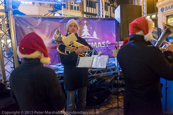 Some musicians with Santa hats