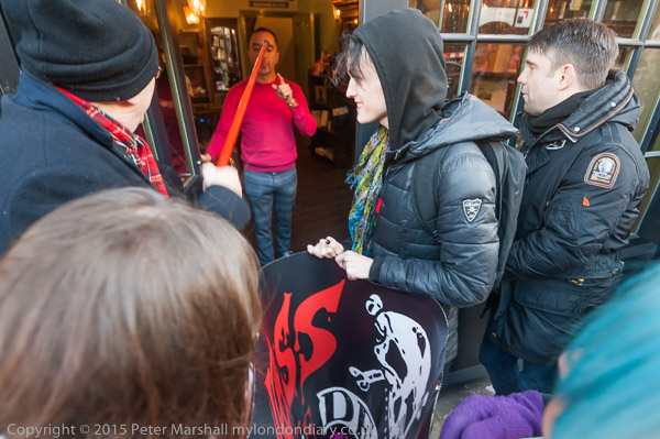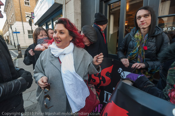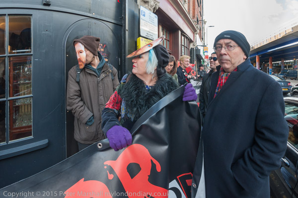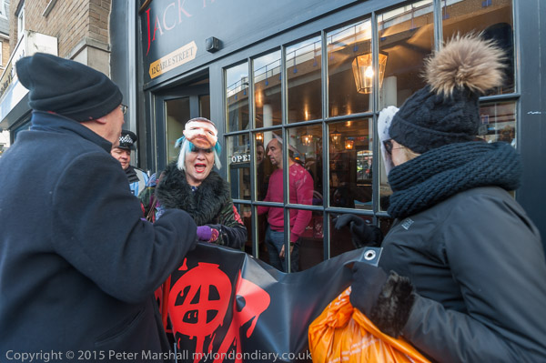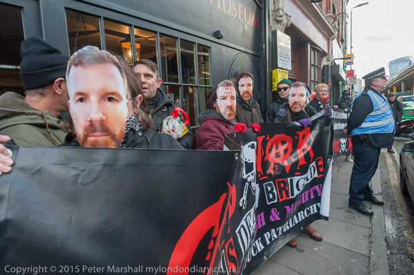 Class War arrive at the Ripper 'museum' with the Womens Death Brigade banner and wearing masks showing