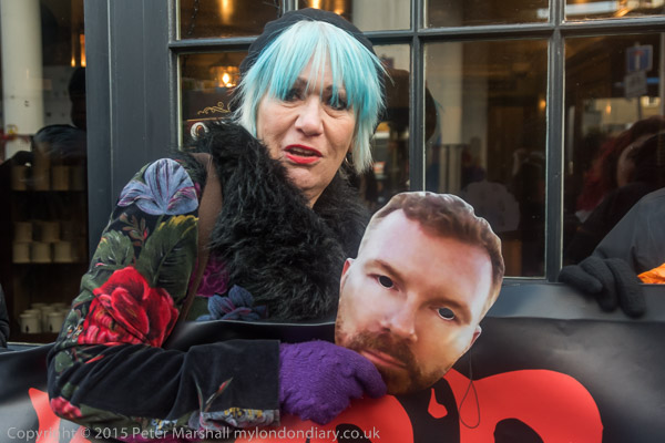 Adam and others from Class War with the Lucy Parsons banner against the wealthy