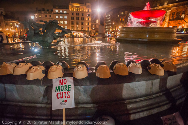 Osborne heads lined up next to the fountain with the message 'No More Cuts'