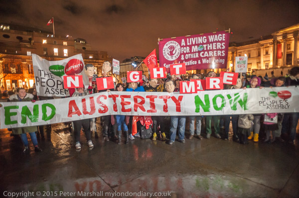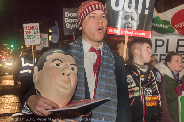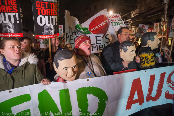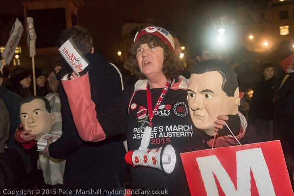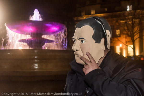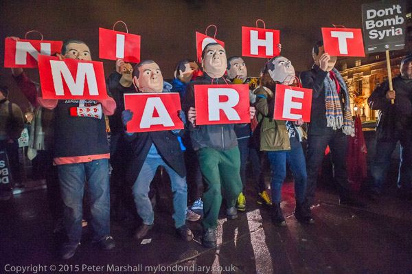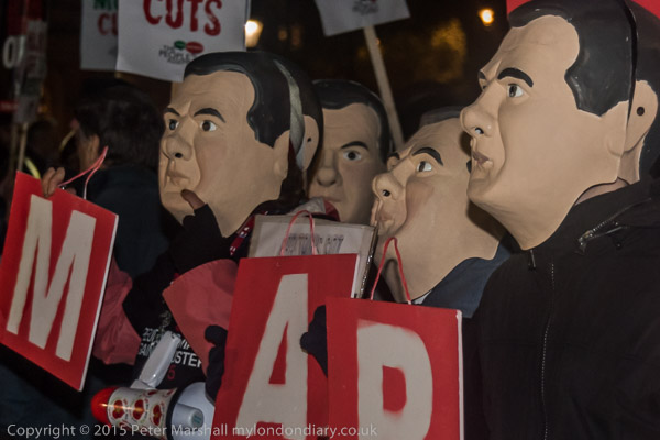 Campiagners wearing Osborne heads hold up letters to spell out NIGHTMARE