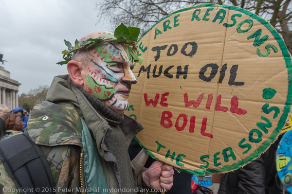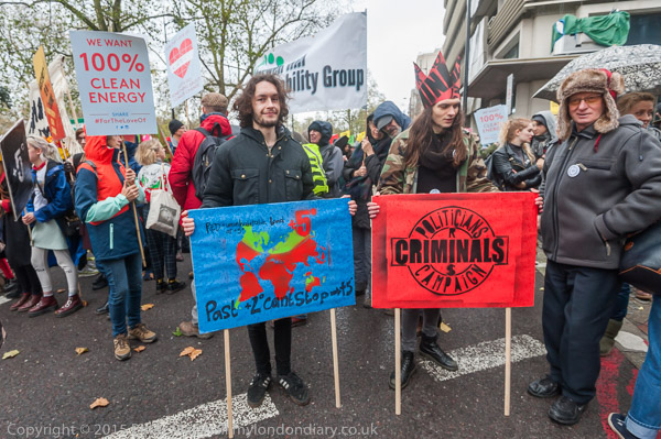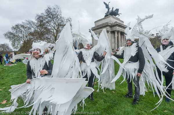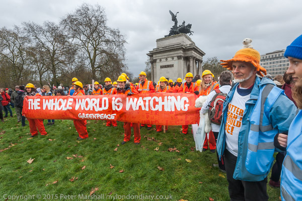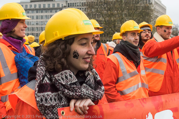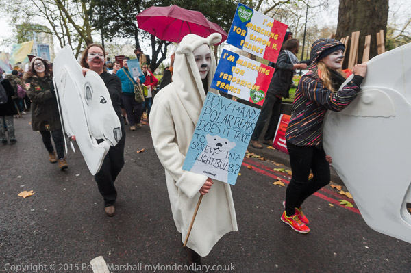 Another polar bear on a protester's head. And a woman marching for two French protesters whose Paris climate march was banned