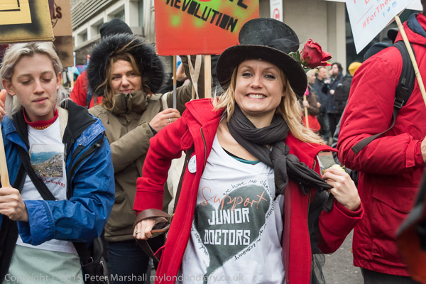 A Junior Doctor shows off the t-shirt that Vivienne Westwood designed for their protest