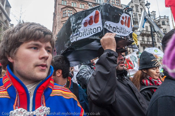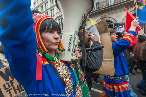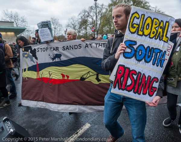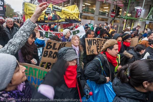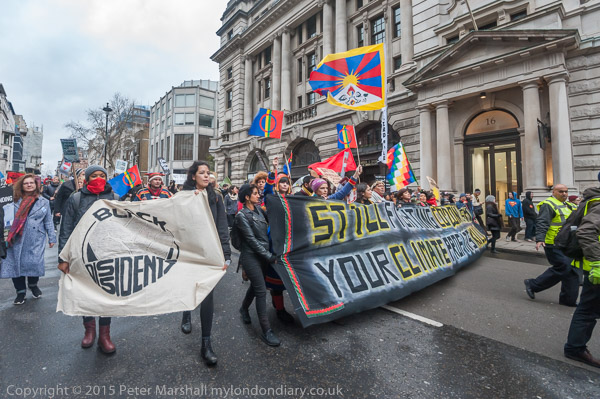 The front of the People's Climate March in Piccadilly with the Global Frontlines banner